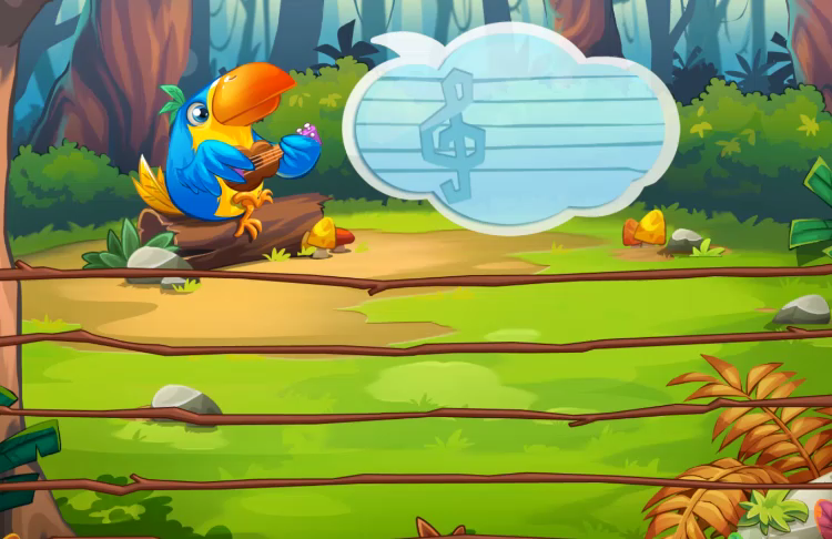 丛林音乐节马上就要到来了,音乐大师鹦鹉正在为节日编曲。随着它的弹奏一些可爱的卡通形象会在五线谱上跳来跳去。游戏者需要根据示例音符所在五线谱的位置,找出与之对应的卡通形象。