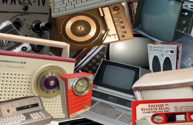 不断变化的画面表现的是老旧传播设备,站在画面中移动脚步,老旧设备就会被清除,变成了现代化的背景。